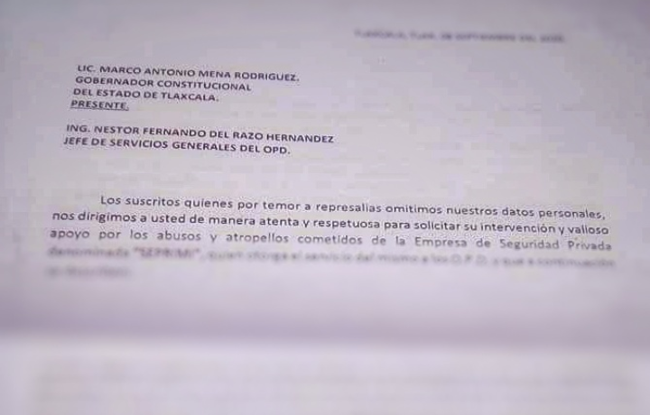Sergio Espinoza.-Con carta abierta dirigida al Gobernador de Tlaxcala, Marco Antonio Mena Rodríguez y al Jefe de Servicios del O. P. D. Secretaría de Salud, Nestor Fernando del Razo Hernández y con copia al Gobierno de la República; trabajadores y ex trabajadores de una empresa de seguridad privada que presta sus servicios en espacios públicos de la SESA en la entidad; pidieron su intervención para atender, resolver y acabar con la serie de abusos, que van desde el pago incompleto de salarios, maltratos, posible corrupción, acoso laboral y hasta sexual.