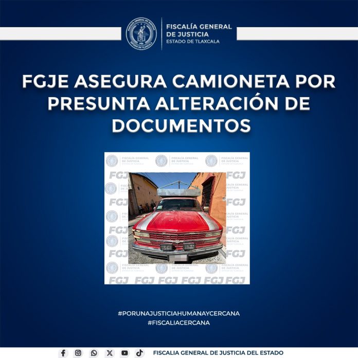 Agentes de la Policía de Investigación de la Fiscalía General de Justicia del Estado (FGJE) aseguraron una camioneta marca Chevrolet, línea Silverado 1500, modelo 1989, por presunta falsificación o alteración y uso indebido de documentos.