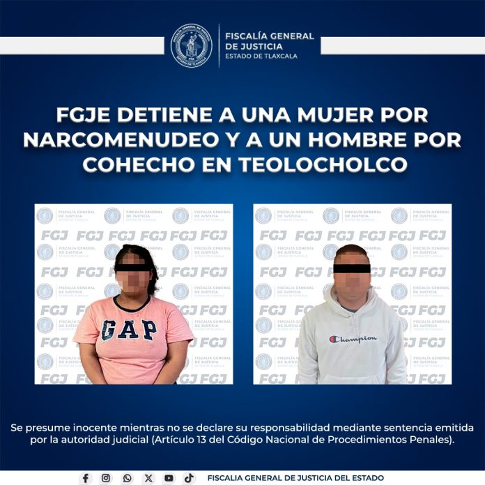 La Fiscalía General de Justicia del Estado (FGJE), a través de la Policía de Investigación, detuvo en flagrancia a Magali N., por su probable responsabilidad en delitos contra la salud, en su modalidad de narcomenudeo, así como a Josué N., por el delito de cohecho, en el municipio de Teolocholco.