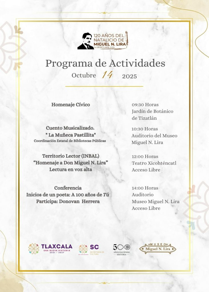 En el marco de la conmemoración de los 500 años de la Fundación de la Ciudad de Tlaxcala, y con motivo del 120 aniversario del natalicio del escritor Miguel N. Lira, el Gobierno del Estado llevará a cabo una jornada cultural conmemorativa el próximo 14 de octubre de 2025, con actividades abiertas al público que buscan rendir homenaje a su legado literario y promover la lectura entre nuevas generaciones.