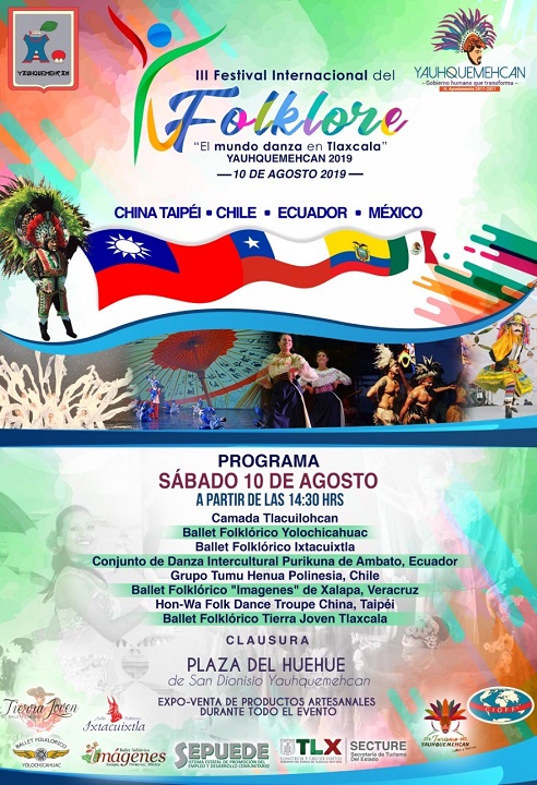 El Festival Internacional del Floklore, se efectuará el 10 de agosto a partir de las 14:30 horas, en el la Plaza del Huehue de la cabecera municipal, “escenario idóneo para exponer el talento, la armonía y la creatividad de los grupos participantes”, destacó el munícipe. Aunado a estas demostraciones dancísticas, se dará espacio a la Expo venta de productos artesanales de esta demarcación.