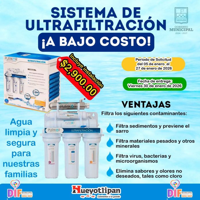 Hueyotlipan, Tlax. – Con el objetivo de proteger la salud y mejorar la calidad de vida de las familias, el Ayuntamiento de Hueyotlipan, encabezado por el presidente municipal Sóstenes E. Bedolla, a través del Sistema Municipal DIF, puso en marcha un programa que ofrece sistemas de ultrafiltración de agua a bajo costo para los hogares del municipio.