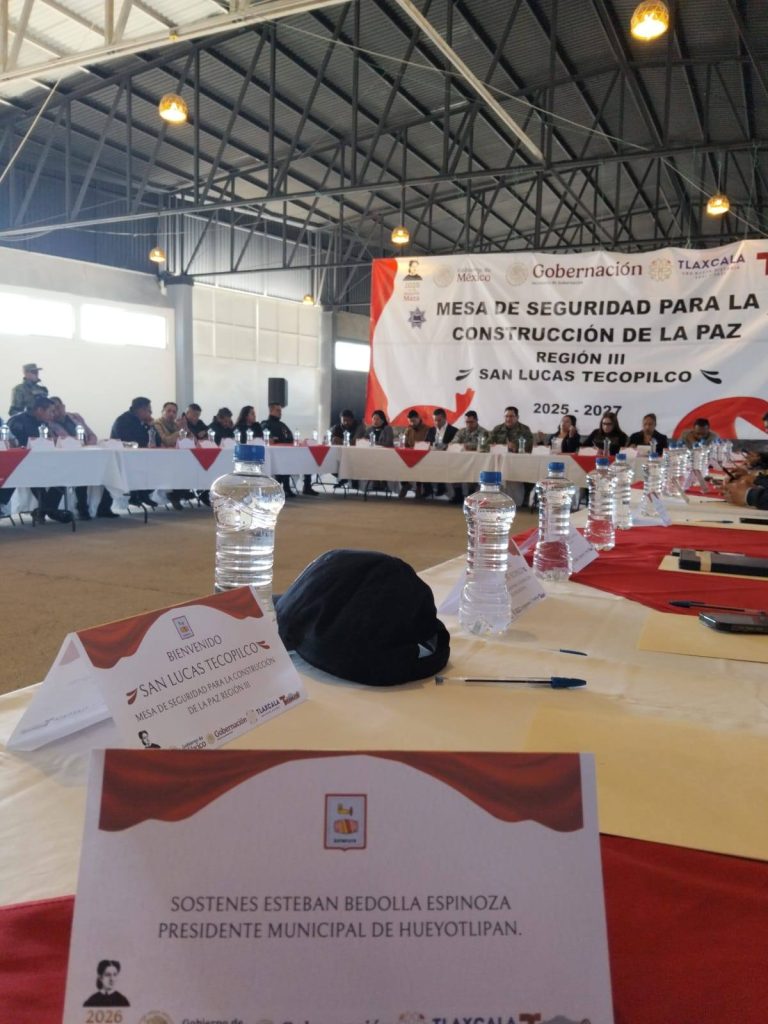 San Lucas Tecopilco, Tlax. – Hueyotlipan en conjunto a autoridades municipales de la región participaron en una nueva sesión de la Mesa de Seguridad para la Construcción de la Paz, realizada en San Lucas Tecopilco, con el objetivo de reforzar la coordinación entre los tres órdenes de gobierno y las corporaciones encargadas de la seguridad pública.