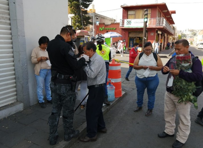 De igual forma, el ayuntamiento de Tlaxcala junto con la Coordinación Estatal de Protección Civil, realizaron la entrega de cubrebocas, 500 caretas y gel antibacterial a comerciantes y ciudadanos que acuden al tianguis sabatino.