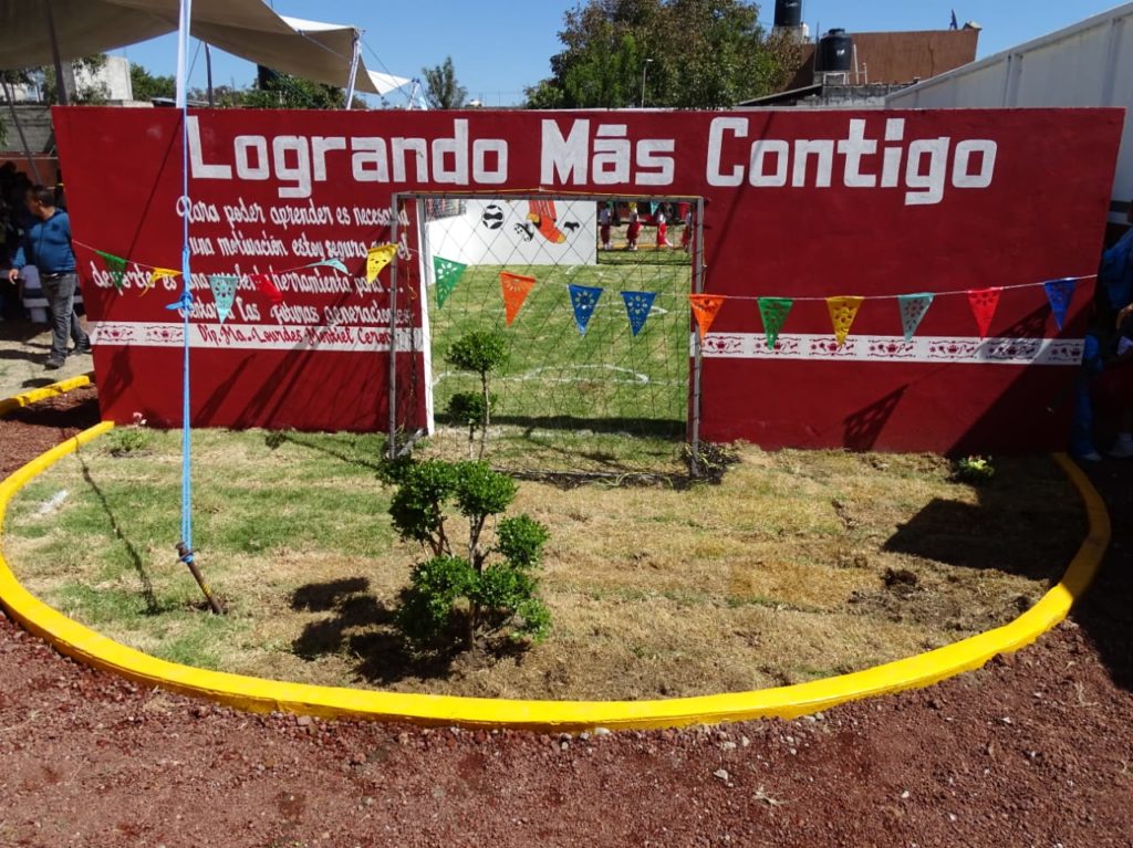 El espacio deportivo consta de una cancha de fútbol rápido, una pista de atletismo, cuatro palapas con sombrillas y bancas, con el que se considera que los educandos tendrán un espacio atractivo para su desarrollo en esa etapa, además de que fomentará el deporte como medio para evitar la obesidad infantil y el sedentarismo.