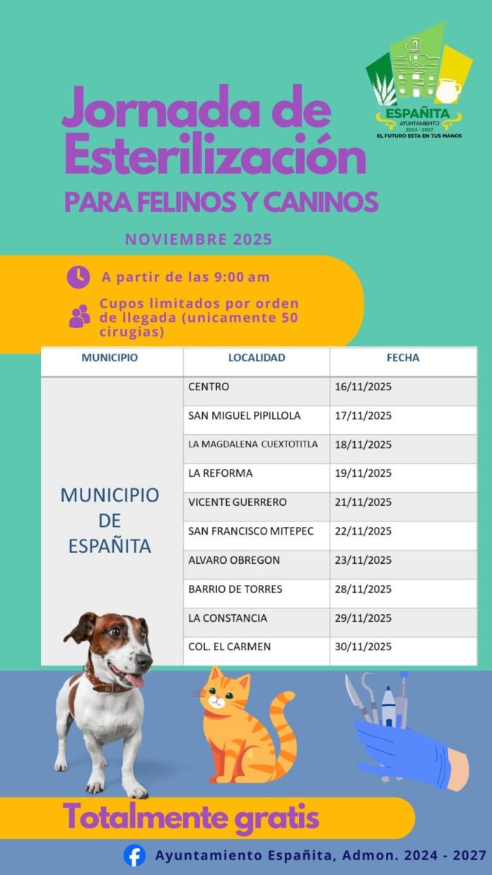 Españita, Tlax. – Con el firme compromiso de promover el bienestar animal y la salud pública, el Ayuntamiento de Españita, encabezado por el presidente municipal Juan Carlos Galindo López, en coordinación con la regidora de Salud, Remedios Hernández López, puso en marcha las Jornadas Gratuitas de Esterilización Canina y Felina correspondientes al mes de noviembre de 2025.