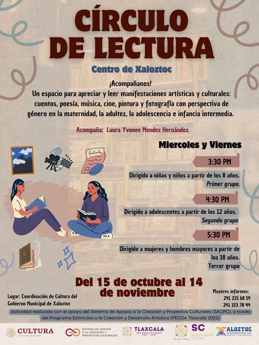 Xaloztoc, Tlax. – El Gobierno Municipal de Xaloztoc, en coordinación con la Secretaría de Cultura del Estado de Tlaxcala, dio inicio a una nueva edición de los Círculos de Lectura, una iniciativa que busca fomentar la reflexión, la creatividad y el diálogo a través de la lectura, el arte y la música. Estas actividades, coordinadas por el área de Cultura Municipal, promueven el desarrollo integral de la comunidad a partir del encuentro con la palabra y las emociones.