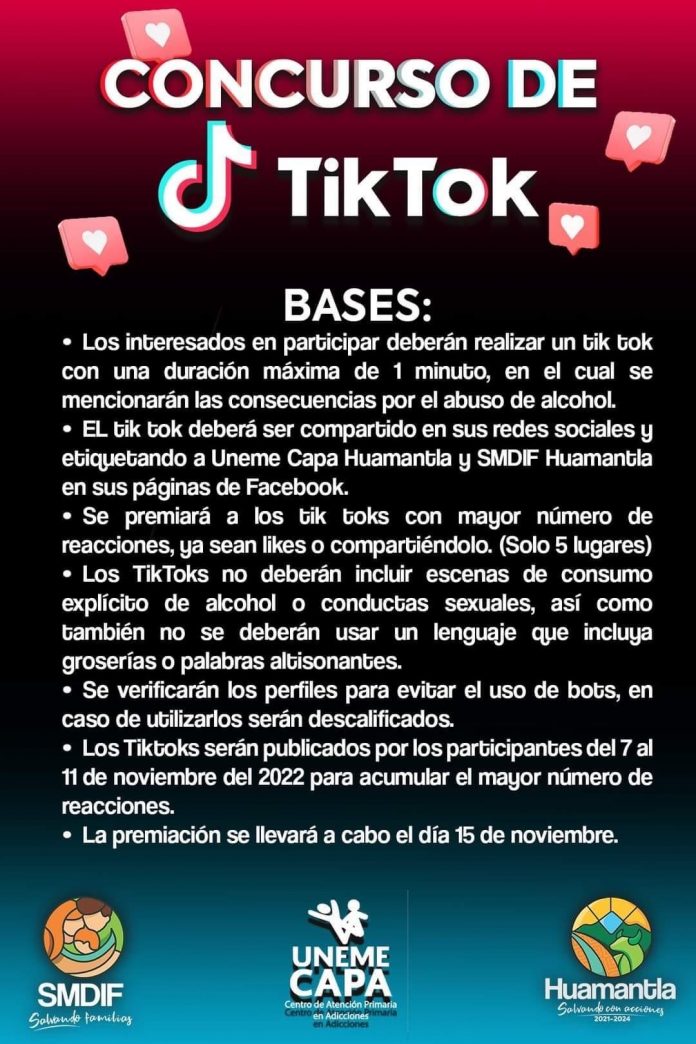 El Tik Tok, deberá ser compartido en sus redes sociales, etiquetando a UNEME CAPA Huamantla y SMDIF Huamantla en sus páginas de Facebook.