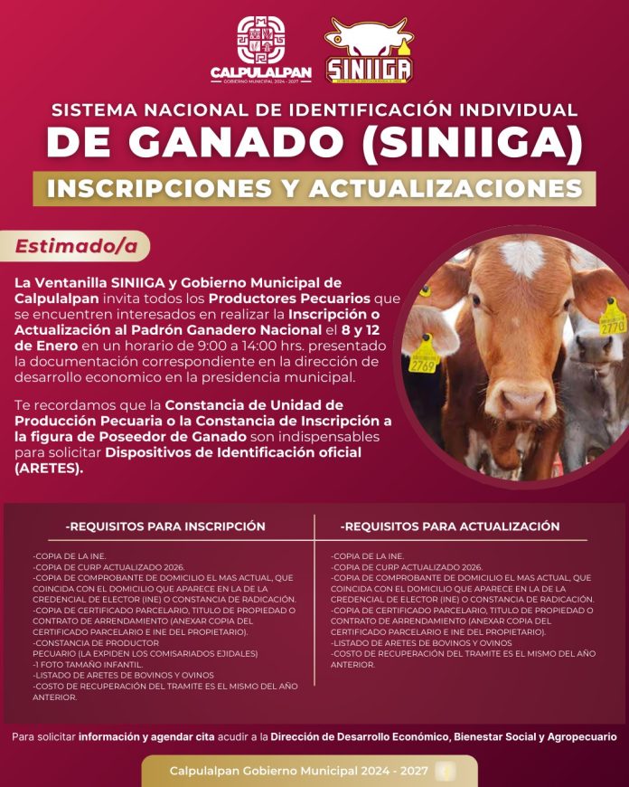 Calpulalpan, Tlax. – Con el objetivo de fortalecer el control sanitario y la trazabilidad del ganado, el Sistema Nacional de Identificación Individual de Ganado (SINIIGA), en coordinación con el Gobierno Municipal de Calpulalpan, encabezado por el presidente municipal José Manuel Jiménez del Razo, anunció una jornada para la inscripción y actualización de productores pecuarios en este padrón nacional.