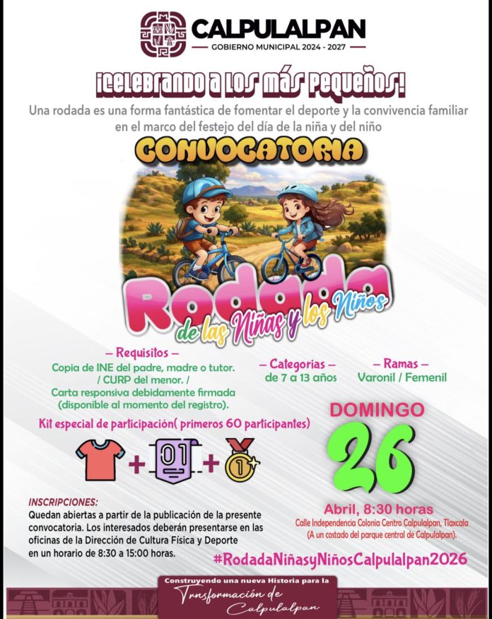 Calpulalpan, Tlax. – Con motivo de la celebración del Día de la Niña y del Niño, el Gobierno Municipal de Calpulalpan anunció la realización de una rodada dirigida a la niñez, con el objetivo de promover la activación física y la convivencia familiar.