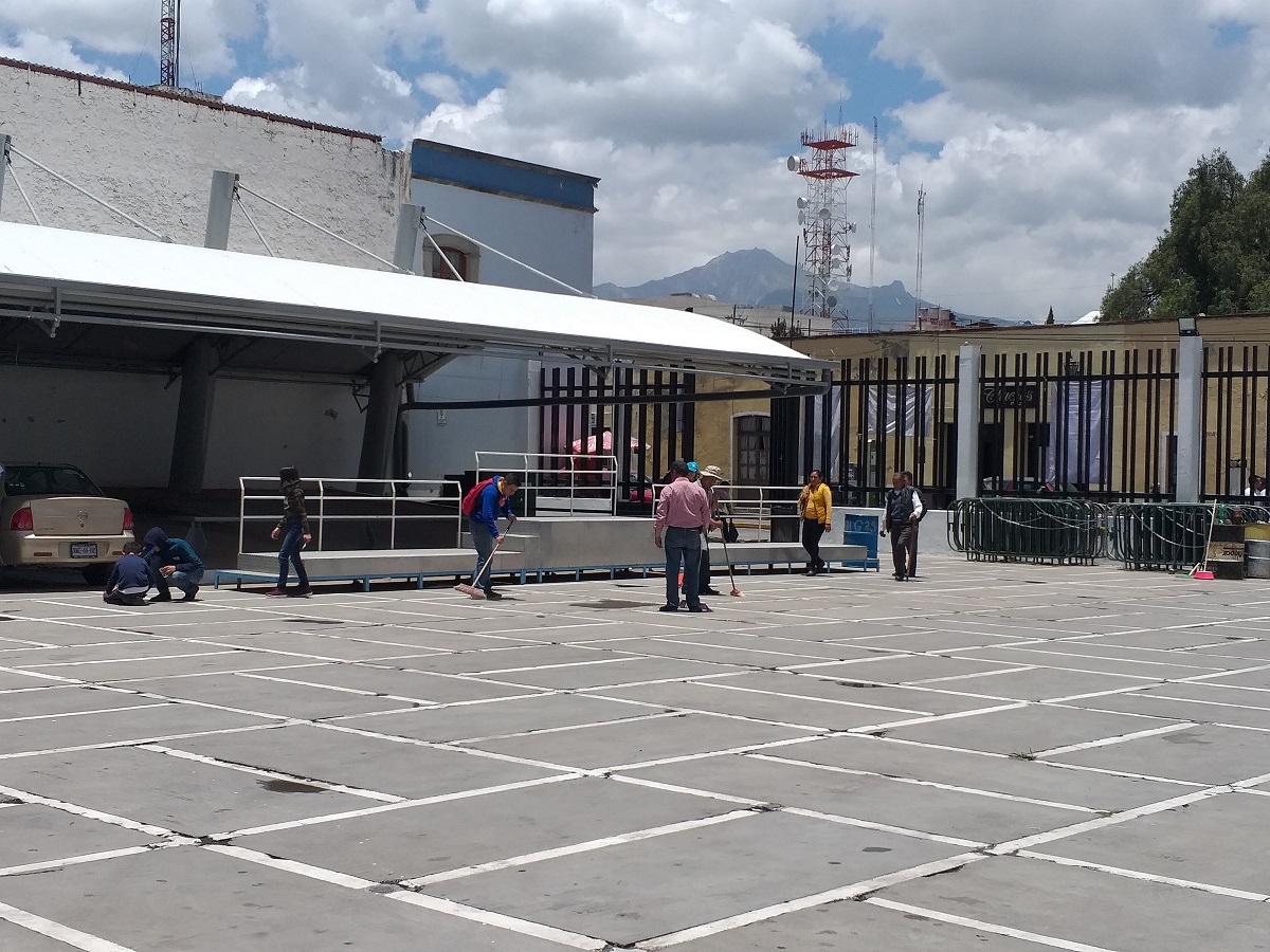 Huamantla, Tlaxcala.- Previo a los festejos religiosos en honor a la Santa Patrona de Huamantla, la Virgen de la Caridad, mismos que dan inicio este 31 de julio y culminan hasta el 31 de agosto, integrantes de las diferentes comisiones, ha dejado listo el atrio de la Basílica donde es venerada esta bendita imagen, para recibir a feligreses tanto locales, como foráneos en este día de júbilo para los Huamantlecos.