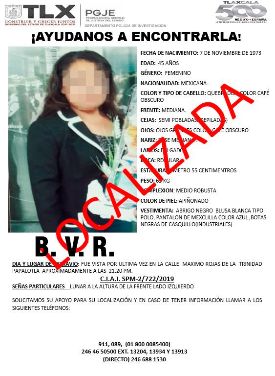 Tlaxcala, Tlax.- La intervención del Grupo de Búsqueda de Personas Desaparecidas de la Procuraduría General de Justicia del Estado (PGJE) permitió localizar a una mujer, luego de que fue reportada como desaparecida en el municipio de Papalotla.
