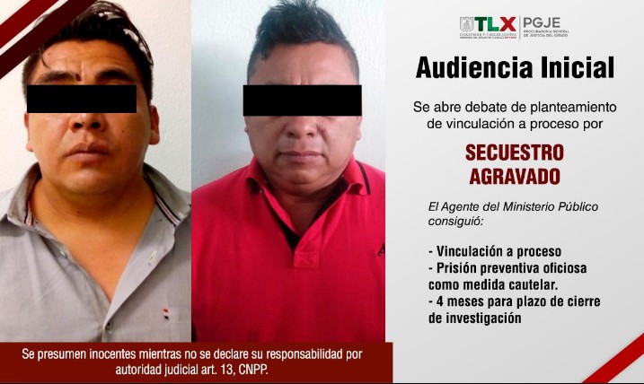 Derivado del trabajo coordinado entre el Agente del Ministerio Público, peritos y oficiales de la Policía de Investigación, la Procuraduría General de Justicia del Estado (PGJE) logró que un Juez de Control vinculara a proceso a Ricardo N., y José Ángel N., presuntamente responsables de liderar una banda de secuestro en Tlaxcala.