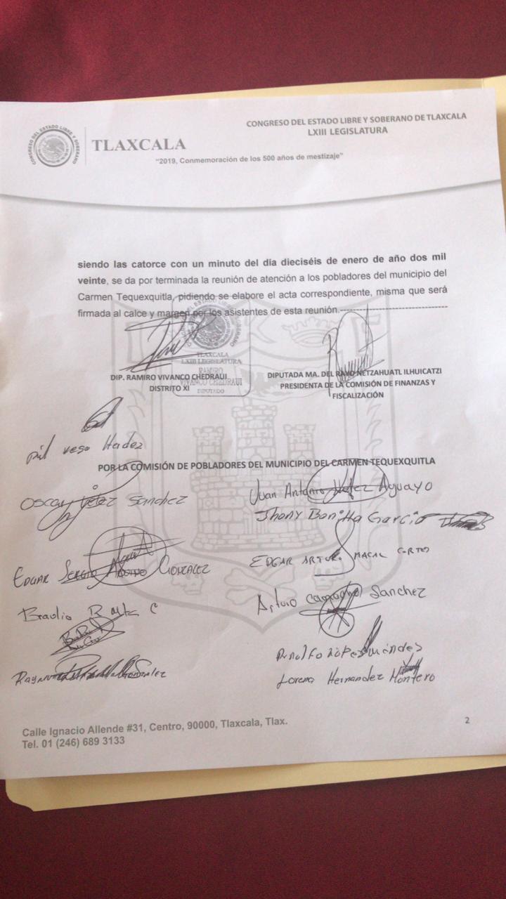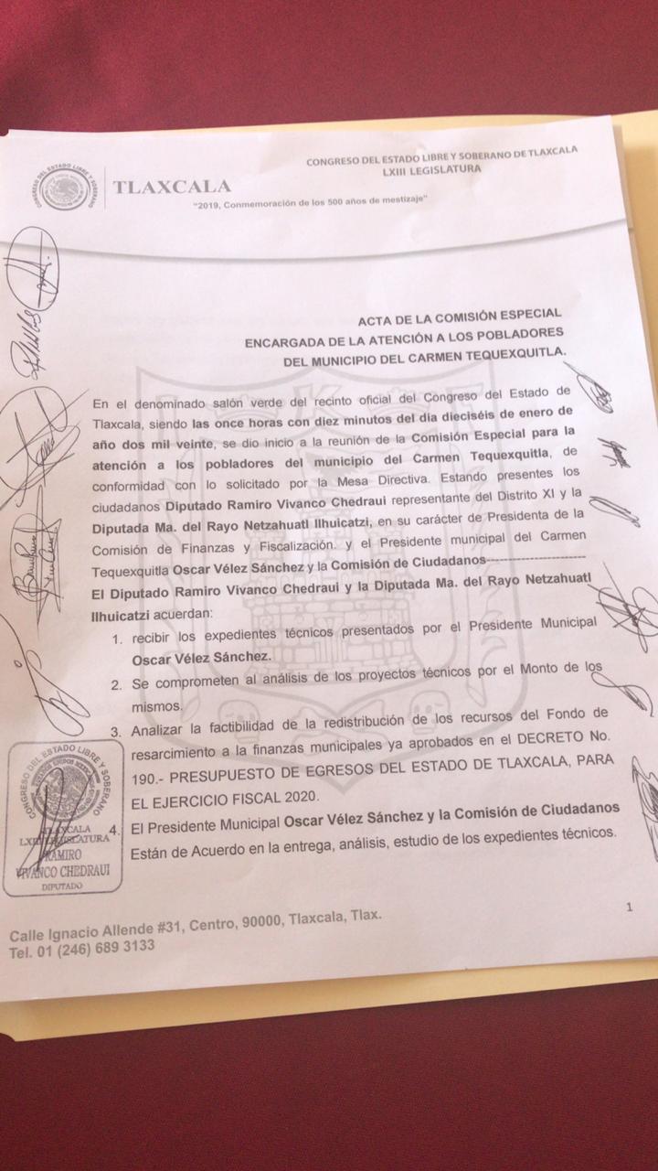 En aquella ocasión, fueron recibidos por una comisión encabezada por la diputada María del Rayo Netzahuatl, quien luego de dialogar con los inconformes, se firmó un documento donde los legisladores se comprometieron a recibir y analizar los expedientes técnicos presentados por el edil de Tequexquitla, y en caso de ser factible se redistribuirían los recursos. Sin embargo, al final no se etiquetaron recursos a tres municipios del estado.
