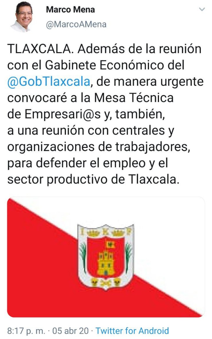 En su perfil de Twitter, Marco Mena escribió: “TLAXCALA. Además de la reunión con el Gabinete Económico del @GobTlaxcala, de manera urgente convocaré a la Mesa Técnica de Empresari@s y, también, a una reunión con centrales y organizaciones de trabajadores, para defender el empleo y el sector productivo de Tlaxcala”.