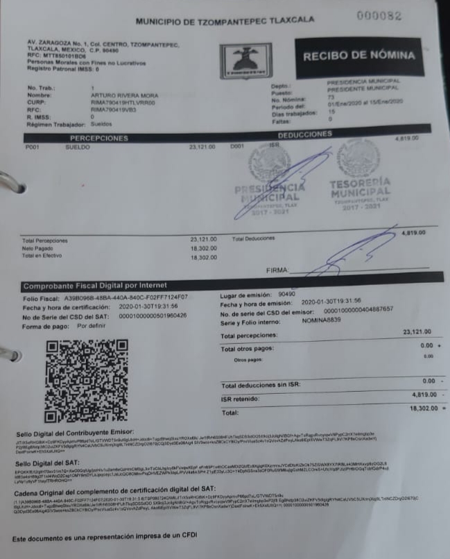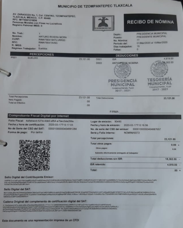 Evidenciando diversos recibos de nómina, el alcalde de Tzompantepec Arturo Rivera Mora negó que su percepción quincenal sea superior al del mandatario nacional, toda vez que su salario asciende a los 23 mil 121 pesos sin descontar el ISR.
