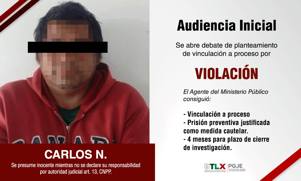 Tlaxcala, Tlax.-La Procuraduría General de Justicia del Estado (PGJE) consiguió de un Juez de Control la vinculación a proceso en contra de Carlos N., por el delito de violación en agravio de su hija en el municipio de Teolocholco.