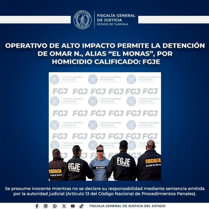 La Fiscalía General de Justicia del Estado (FGJE) y la Fiscalía General de Justicia del Estado de México (FGJEM) lograron la detención, mediante una colaboración institucional, de Omar N., alias “El Monas”, considerado un objetivo relevante por su presunta participación en el delito de homicidio calificado en territorio mexiquense.