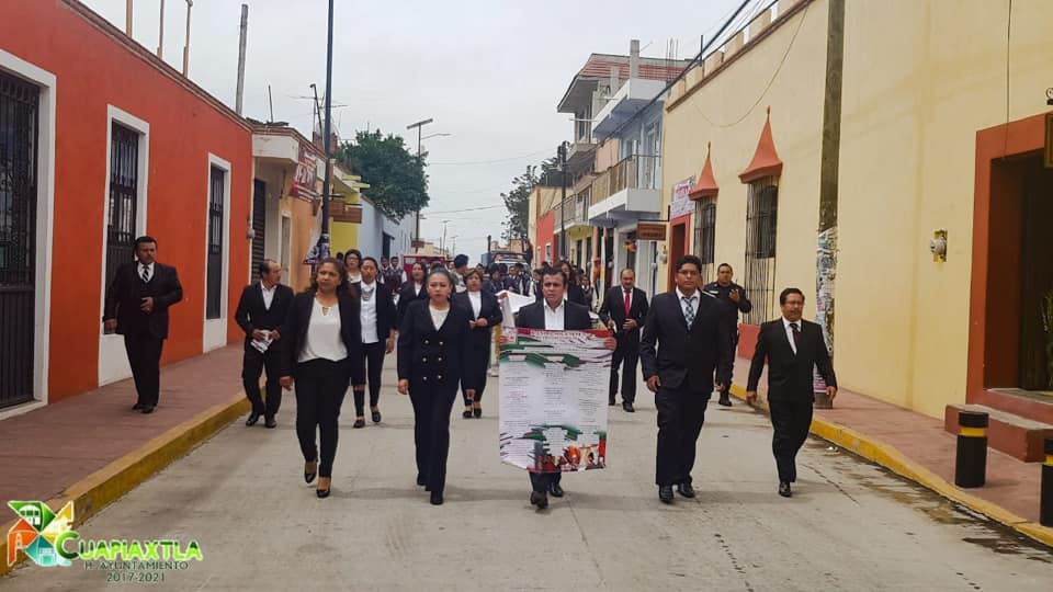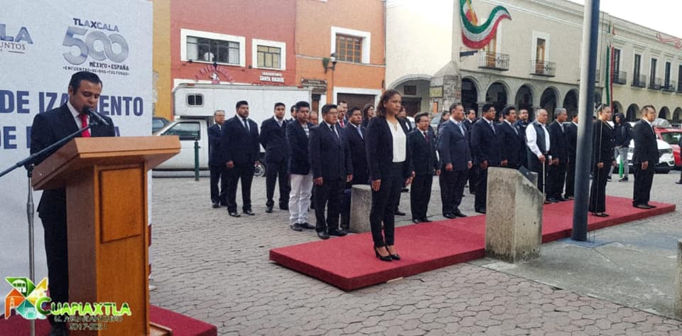 Tlaxcala, Tlax.- El Presidente Municipal de Cuapiaxtla, Arturo Hernández Hernández encabezó la ceremonia de Izamiento de Bandera y Homenaje al Lábaro Patrio en la Capital del Estado de Tlaxcala, acompañado de la presidenta honorifica del SMDIF, Sindico, Regidores, Directores de área y personal administrativo.
