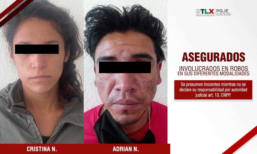 La Policía de Investigación adscrita a la Procuraduría General de Justicia del Estado (PGJE) aseguró a Cristina N., y Adrián N., ya que presuntamente están involucrados en el delito de robo calificado en sus diferentes modalidades.