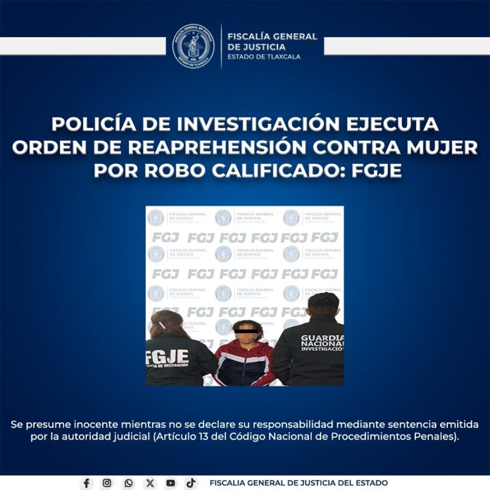 Agentes de la Policía de Investigación de la Fiscalía General de Justicia del Estado (FGJE) ejecutaron una orden de reaprehensión en contra de Guadalupe N., por el incumplimiento de las medidas cautelares impuestas dentro del proceso penal que enfrenta por el delito de robo calificado.