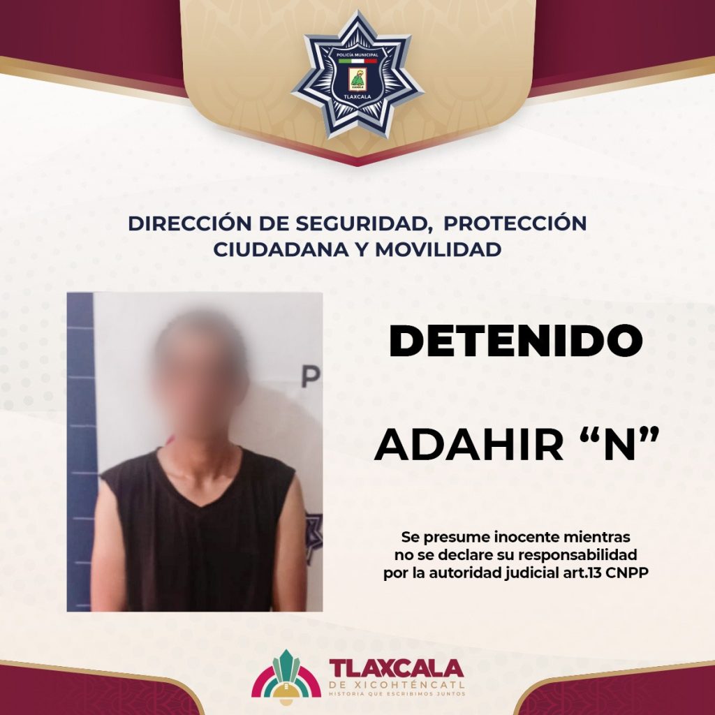 El detenido fue identificado como Adahir “N”, de 31 años de edad, quien fue trasladado a las instalaciones de la Dirección de Seguridad, Protección Ciudadana y Movilidad del Municipio de Tlaxcala, donde quedó a disposición del Juzgado Municipal.