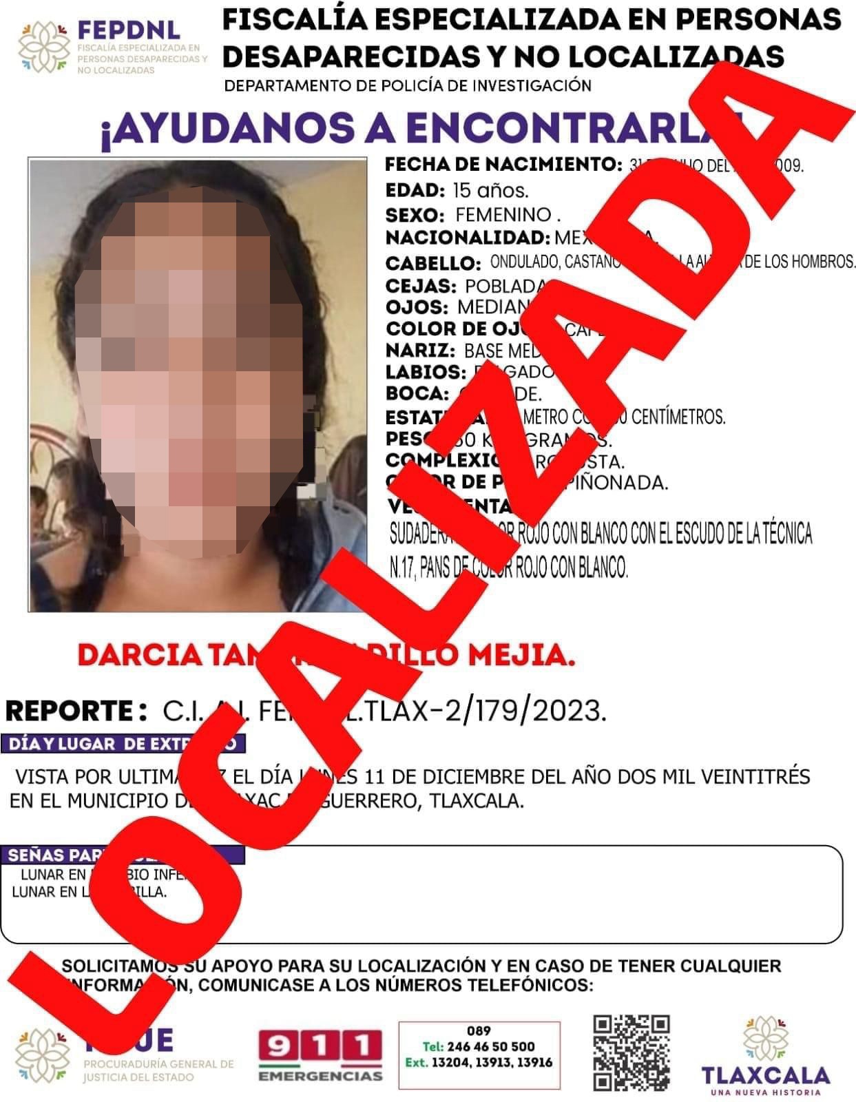 Derivado de la denuncia presentada por familiares de la adolescente, agentes de Investigación realizaron las labores de búsqueda correspondientes; sin embargo, personal de la Comisión Estatal de Búsqueda de Personas (CEBP) les informó que la menor se encontraba en sus instalaciones acompañada de su tío.