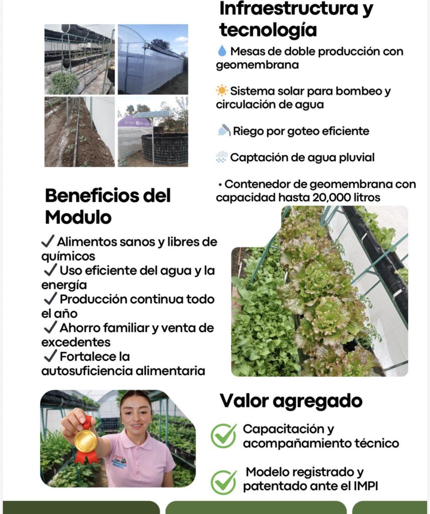 De acuerdo con la información presentada, todos los módulos contarán con infraestructura especializada, como mesas de doble producción con geomembrana, sistema solar para bombeo y riego por goteo, captación de agua pluvial con capacidad de hasta 20 mil litros y capacitación técnica sin costo para las y los beneficiarios.
