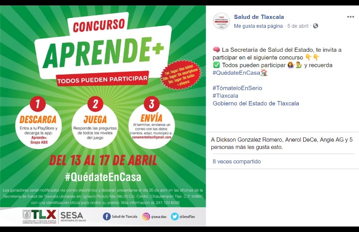 Tlaxcala,Tlax.-La Secretaría de Salud (SESA) promueve a través de sus plataformas digitales y redes sociales actividades de autocuidado para el sector juvenil, durante la emergencia sanitaria por Covid-19.