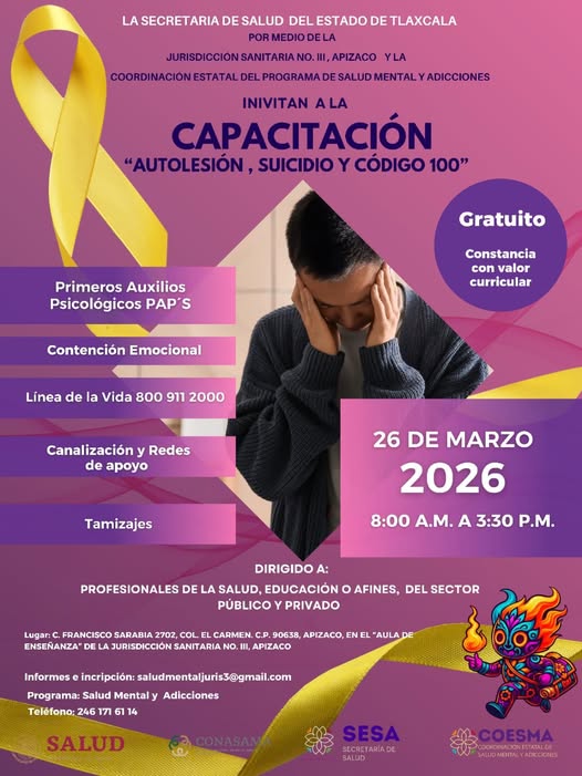 Hueyotlipan, Tlax. – Con el objetivo de fortalecer la prevención y atención en temas de salud mental, autoridades de Hueyotlipan difundieron la invitación a participar en la capacitación titulada “Autolesión, Suicidio y Código 100”, dirigida a personal del sector salud, educativo y público interesado.