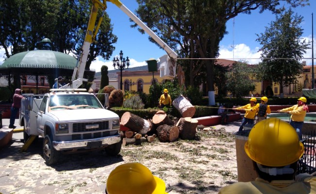 Tlaxco,Tlax.-Como parte de los trabajos de rehabilitación del parque histórico del Pueblo Mágico de Tlaxco, sepodan más de diez árboles y se retirarán cuatro robles australianos, que cuentan con 68 años de edad y presentan afectación por una bacteria, siendo estos un factor de riesgo para los transeúntes.
