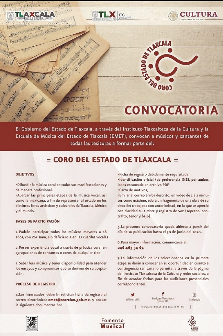 El Gobierno del Estado y la Secretaría de Cultura a través del Instituto Tlaxcalteca de la Cultura (ITC) informó que la novena edición del Festival Internacional de Coros “Tlaxcala Canta” se realizará a finales de este año.