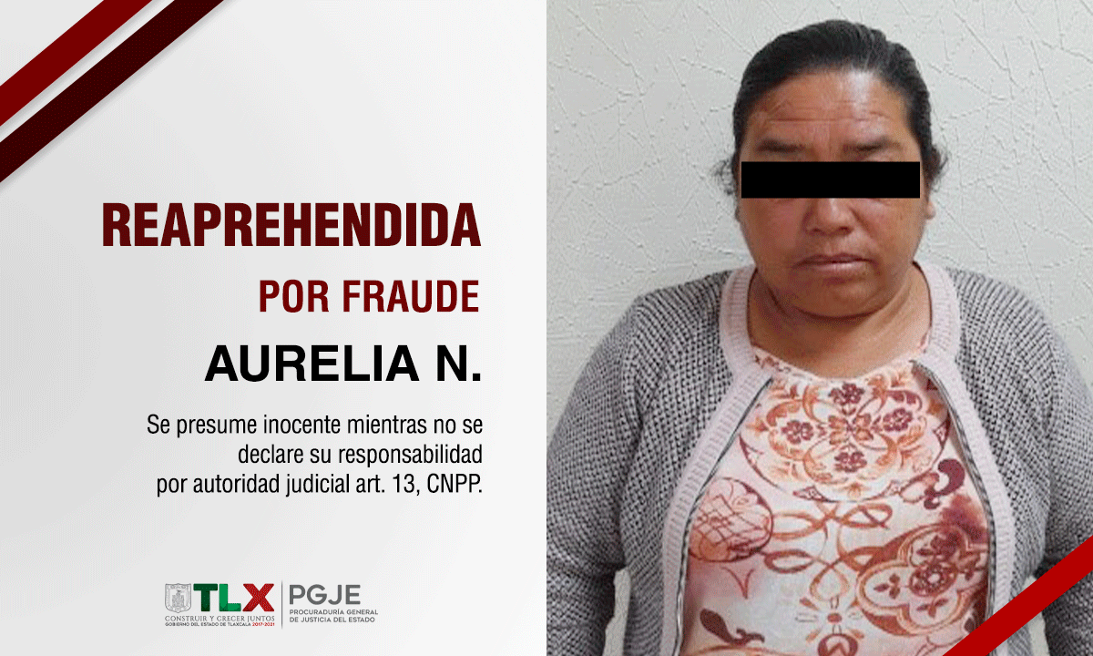 Derivado de los trabajos realizados por los oficiales de la Policía de Investigación y peritos, aunado a la aportación de datos contundentes por el Agente del Ministerio Público, todos adscritos a la Procuraduría General de Justicia del Estado (PGJE), se logró la reaprehensión de Aurelia N., quien contaba con un mandamiento judicial por el delito de fraude.