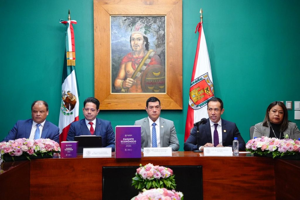 Diputadas y diputados de la LXV Legislatura del Congreso del Estado de Tlaxcala recibieron este día el Paquete Económico para el ejercicio fiscal 2026, en una ceremonia encabezada por el presidente de la Junta de Coordinación y Concertación Política, Ever Alejandro Campech Avelar; la presidenta de la Mesa Directiva, Maribel León Cruz; y el presidente de la Comisión de Finanzas y Fiscalización, Bladimir Zainos Flores, quienes junto con las y los legisladores integrantes de dicha comisión, recibieron el documento de manos del Secretario de Gobierno, Luis Antonio Ramírez Hernández, y del Secretario de Finanzas, David Álvarez Ochoa.