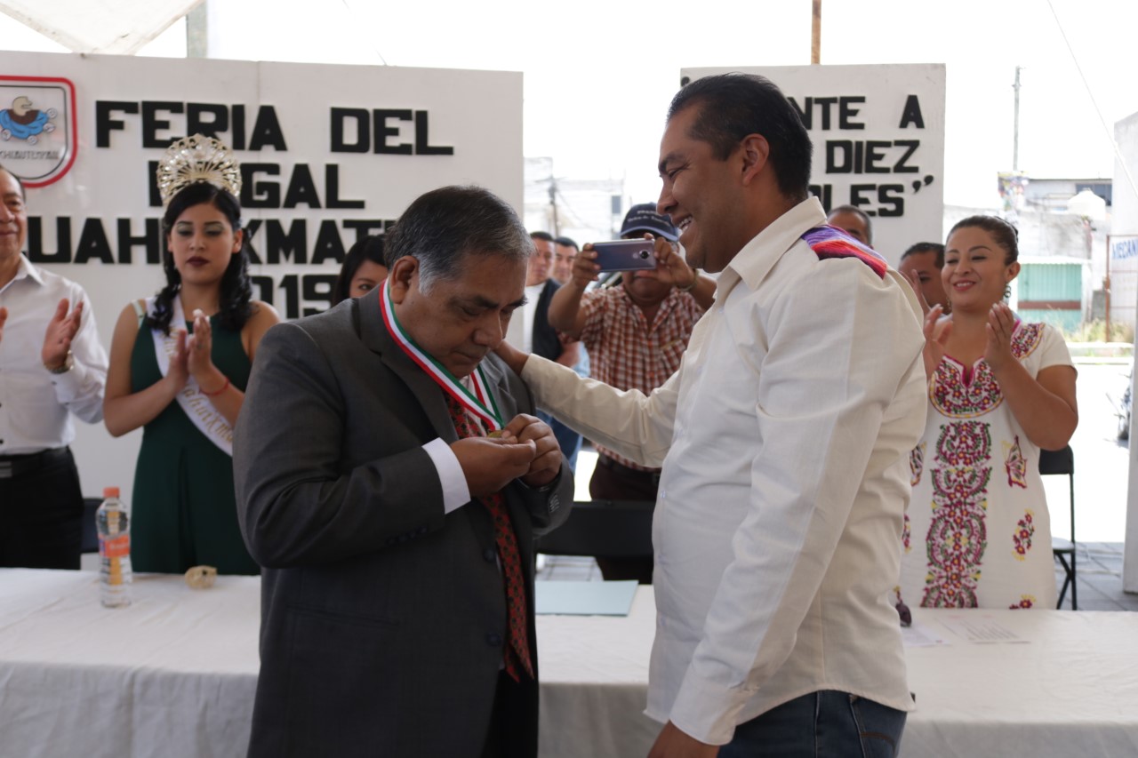 Chiautempan, Tlax.- El presidente Héctor Domínguez Rugerio, junto con el Secretario del Ayuntamiento el C. Nicolás Gutiérrez De Casa, en el marco de la inauguración de la feria del Nogal de San Bartolomé Cuahuixmatlac, hizo entrega de la presea al mérito ciudadano al presbítero Adrián Gutiérrez Pérez.