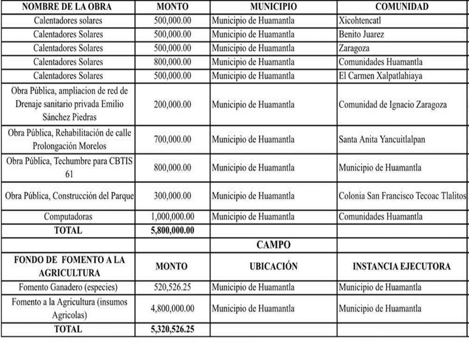 Huamantla, Tlax.- De acuerdo a información obtenida por El Imparcial de Tlaxcala, para beneficio del Municipio de Huamantla, que gobierna el priísta, Jorge Sánchez Jasso, fueron etiquetados en el Congreso local, 11 millones 120 mil 526 pesos, de los cuales: cinco millones 800 mil pesos corresponden al Fondo para el Fortalecimiento de Obras y Acciones a Municipios, y cinco millones 320 mil 526 pesos del Fondo de Fomento a la Agricultura.
