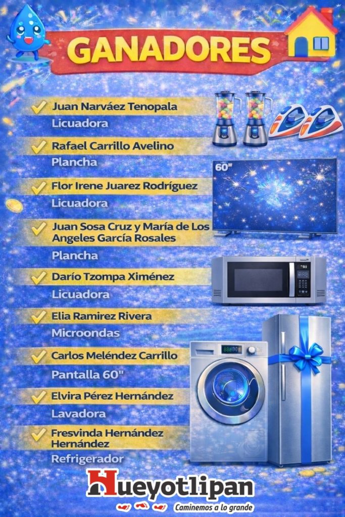 Hueyotlipan, Tlax. – Como una forma de incentivar la cultura de la responsabilidad fiscal y agradecer la confianza de la ciudadanía, el H. Ayuntamiento de Hueyotlipan 2024–2027, encabezado por el presidente municipal Sóstenes E. Bedolla Espinoza, llevó a cabo el Gran Sorteo de Electrodomésticos y artículos de línea blanca, dirigido a quienes realizaron de manera oportuna el pago del impuesto predial y del servicio de agua potable durante el mes de diciembre.