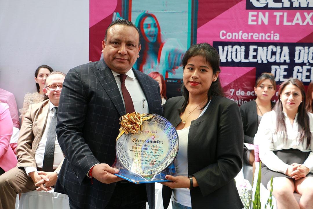 Tlaxcala, Tlax.- La Organización Civil “Mujeres con Poder” entregó un reconocimiento al titular de la Procuraduría General de Justicia del Estado (PGJE) José Antonio Aquiahuatl Sánchez, por su trabajo en favor de la atención de delitos en contra de las mujeres, lo que es una muestra del compromiso y trabajo institucional para beneficio de este sector de la población.