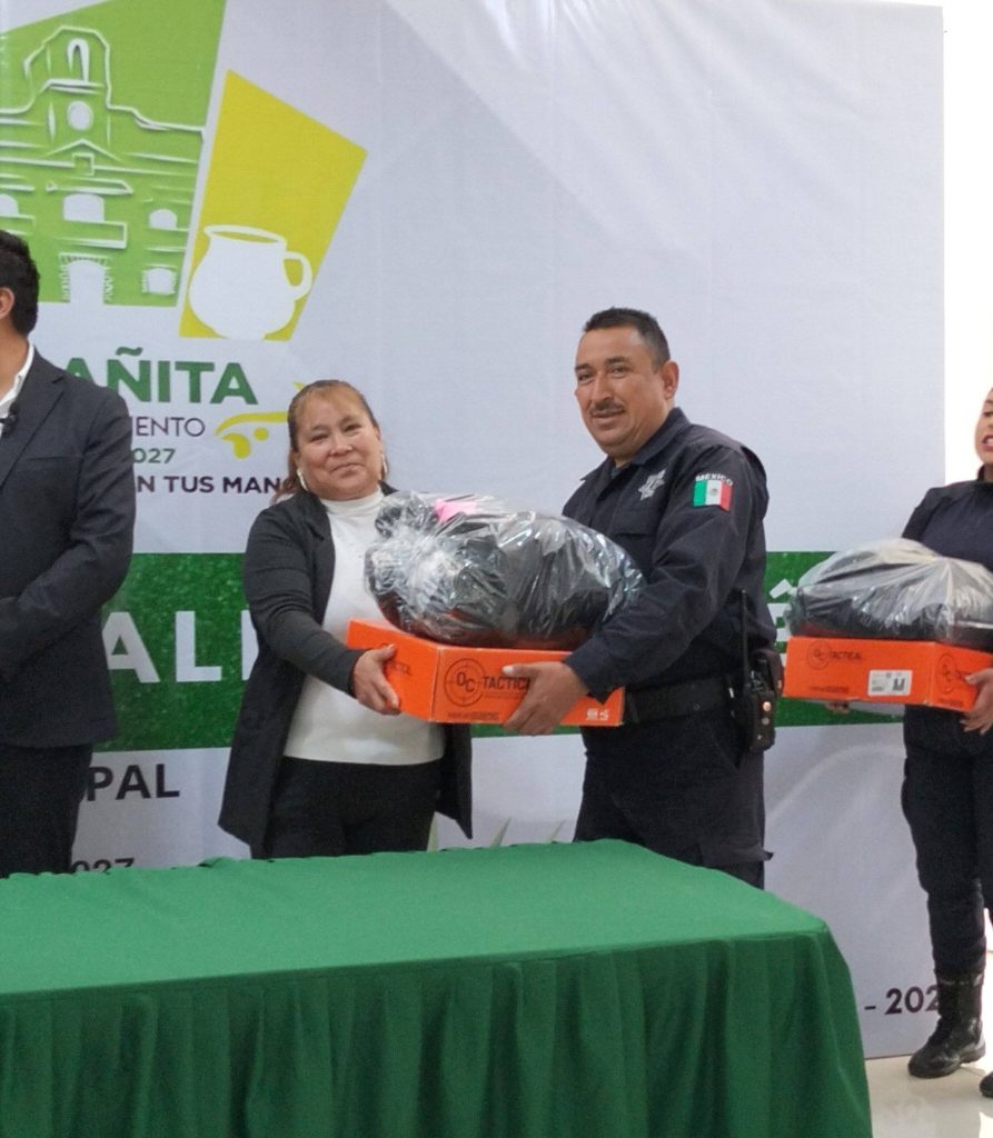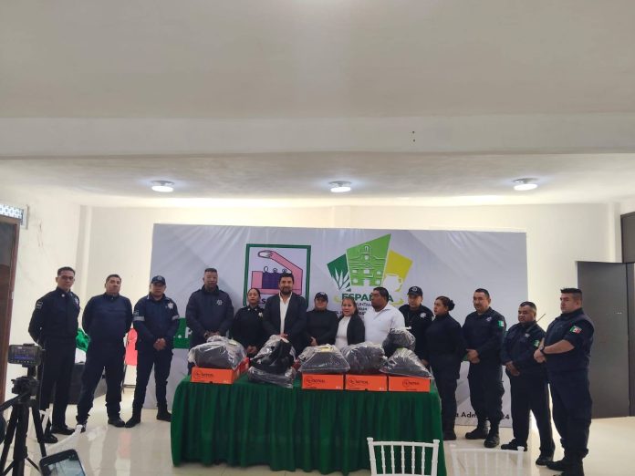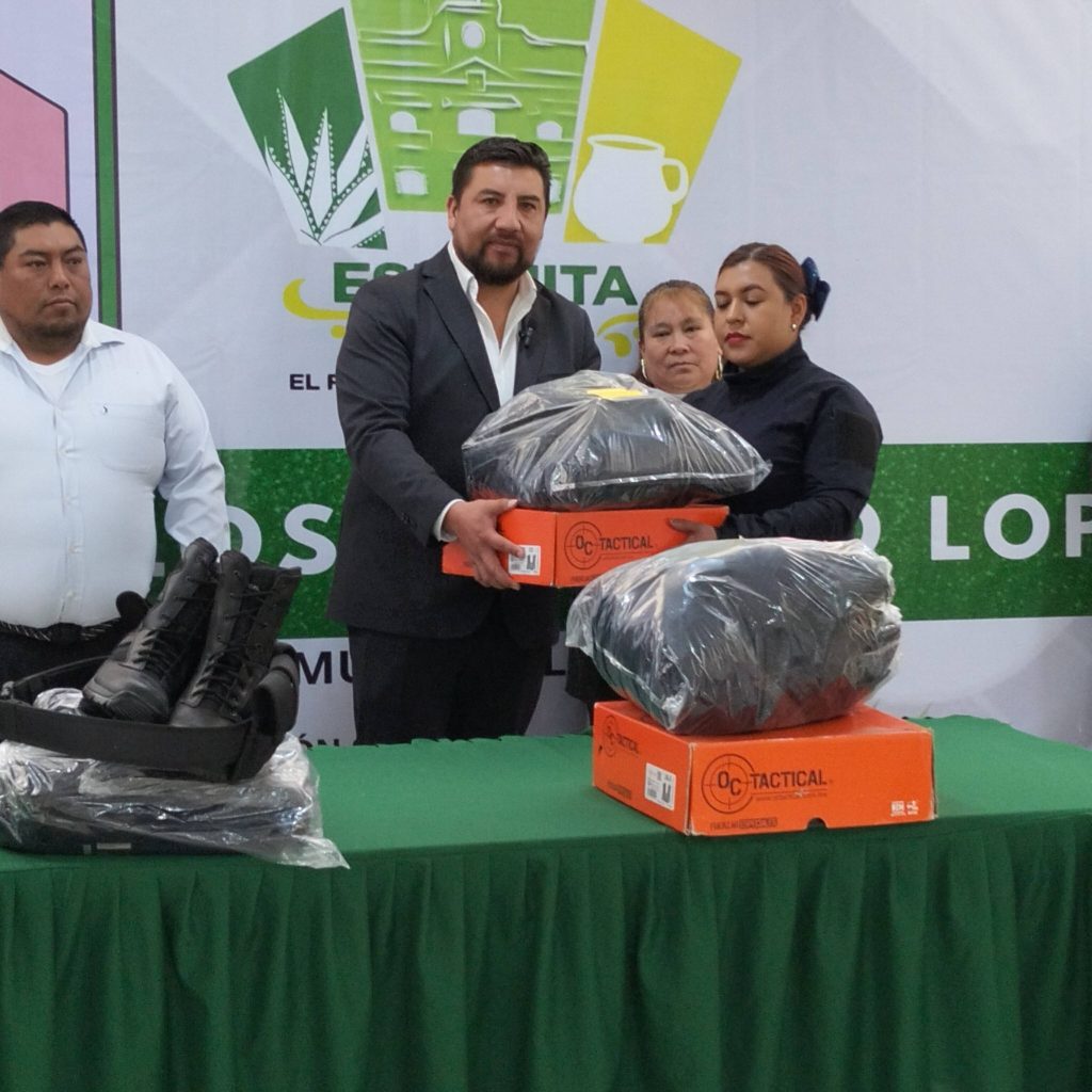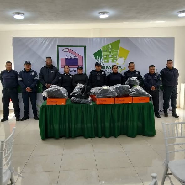 Españita, Tlax. – Con el objetivo de fortalecer las labores de vigilancia y protección en el municipio, el presidente municipal de Españita, Juan Carlos Galindo López, encabezó la entrega de equipamiento al personal de Seguridad Pública, acompañado por el regidor de Seguridad y la regidora de Educación.