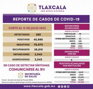 Los datos de la SESA registrados en la plataforma nacional del Sistema de Vigilancia Epidemiológica de Enfermedades Respiratorias (Sisver), confirmaron 260 casos positivos de Covid-19 y cero defunciones, el 12 de julio de 2022 en la entidad.
