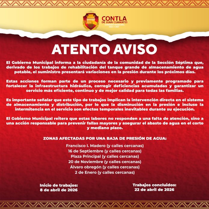 Contla, Tlax. – El gobierno municipal de Contla de Juan Cuamatzi informó que, derivado de trabajos de rehabilitación en el tanque principal de almacenamiento de agua potable, se presentarán variaciones en la presión del servicio en la Sección Séptima durante los próximos días.