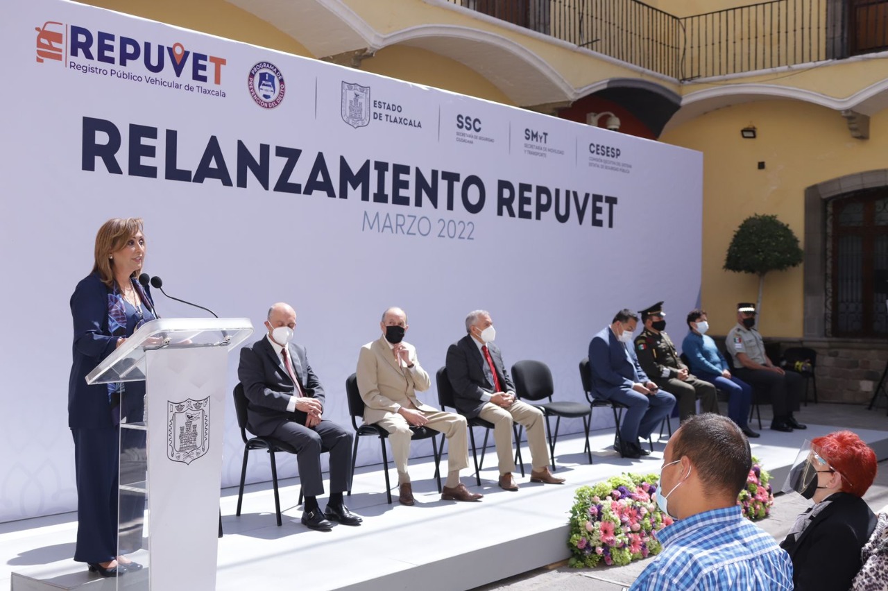 La gobernadora del estado encabezó el relanzamiento del programa del Registro Público Vehicular de Tlaxcala (Repuvet), con el objetivo de utilizar la tecnología como una herramienta de seguridad que permita abatir el robo de vehículos, además de que es un programa de cobertura nacional que identifica y certifica sin costo la posesión legal de un automóvil.