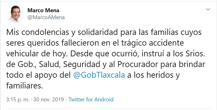 “Mis condolencias y solidaridad para las familias cuyos seres queridos fallecieron en el trágico accidente vehicular de hoy. Desde que ocurrió, instruí a los Srios. de Gob., Salud, Seguridad y al Procurador para brindar todo el apoyo del @GobTlaxcala a los heridos y familiares”, escribió.