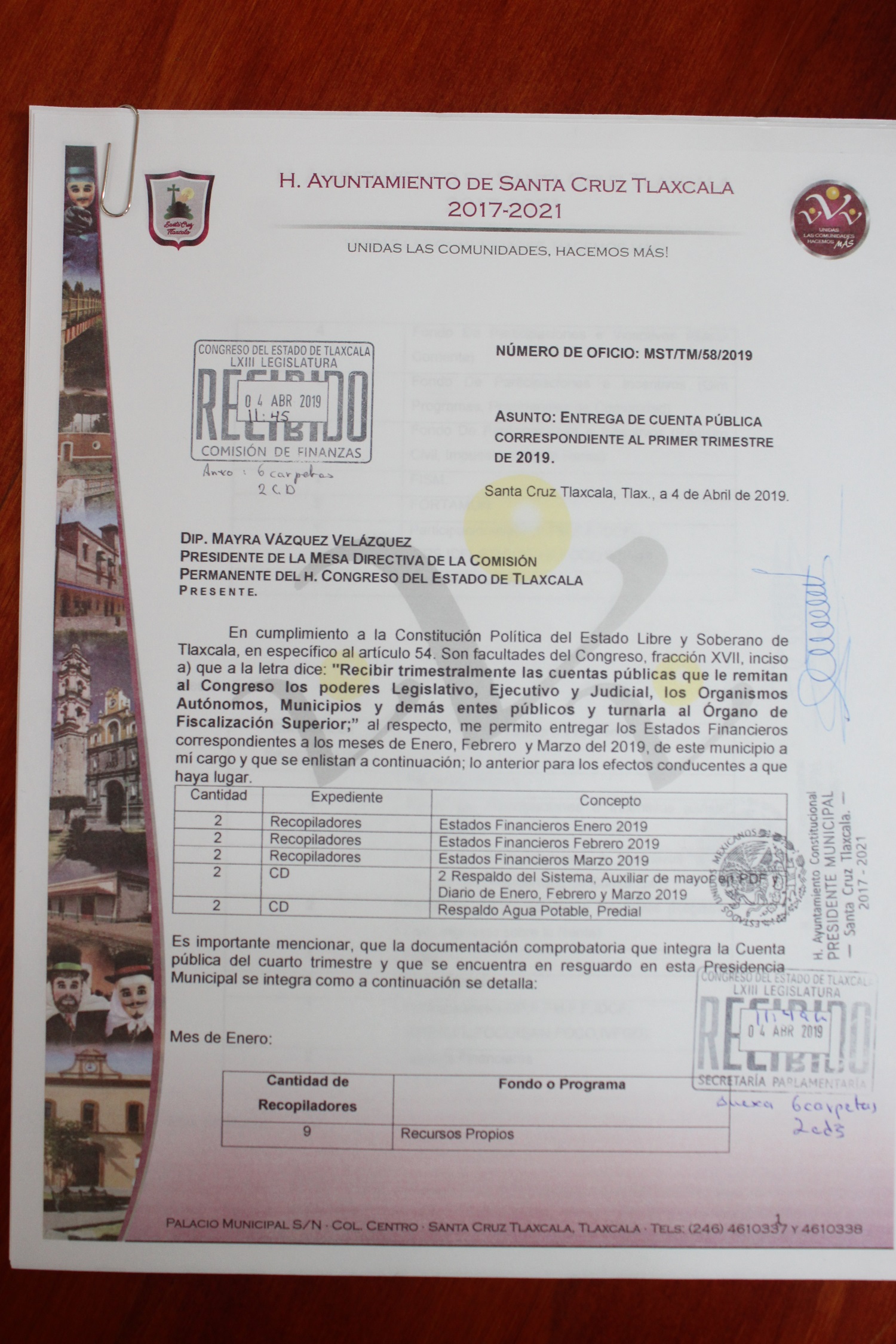 El municipio de Santa Cruz Tlaxcala hace entrega de la cuenta pública correspondiente al primer trimestre del 2019; siendo éste el primero de los 105 entes fiscalizables en rendir cuenta pública.
