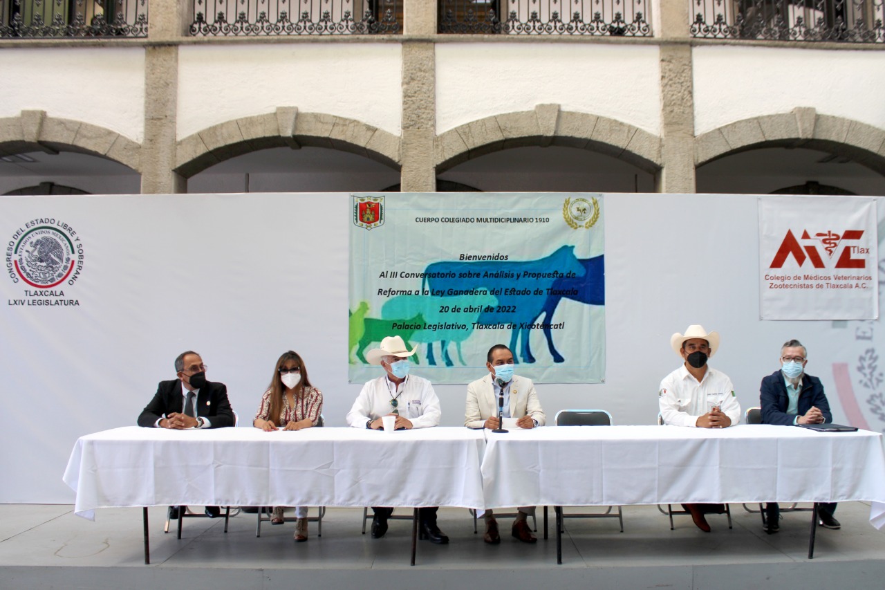 Integrantes del Cuerpo Colegiado Multidisciplinario 1910 y el Colegio de Médicos Veterinarios Zootecnistas de Tlaxcala A.C., llevaron a cabo en el Patio Vitral del Congreso del Estado el III Conversatorio sobre Análisis y Presupuesto de la Reforma a la Ley Ganadera, con el objetivo de presentar propuestas por especialistas para actualizar el marco jurídico acorde a las necesidades del sector ganadero y agropecuario en general.