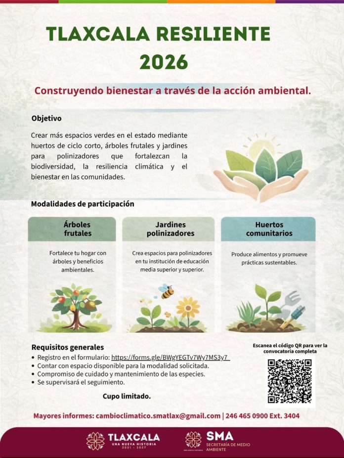 La Secretaría de Medio Ambiente del Estado (SMA) emitió la convocatoria pública “Tlaxcala Resiliente 2026”, un programa estatal enfocado en implementar soluciones basadas en la naturaleza con participación ciudadana, instituciones educativas y municipios, con el objetivo de fortalecer la resiliencia climática y ambiental en el territorio.