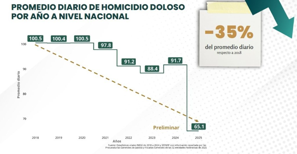 De acuerdo con el reporte del SESNSP, en los últimos 14 meses, se ha mantenido una tendencia a la baja en el homicidio doloso, pues el promedio diario por año disminuyó en 35 por ciento respecto al 2018, pasando de 100.5 a 65.1, lo que indica que 2025 es el año con menos homicidios.