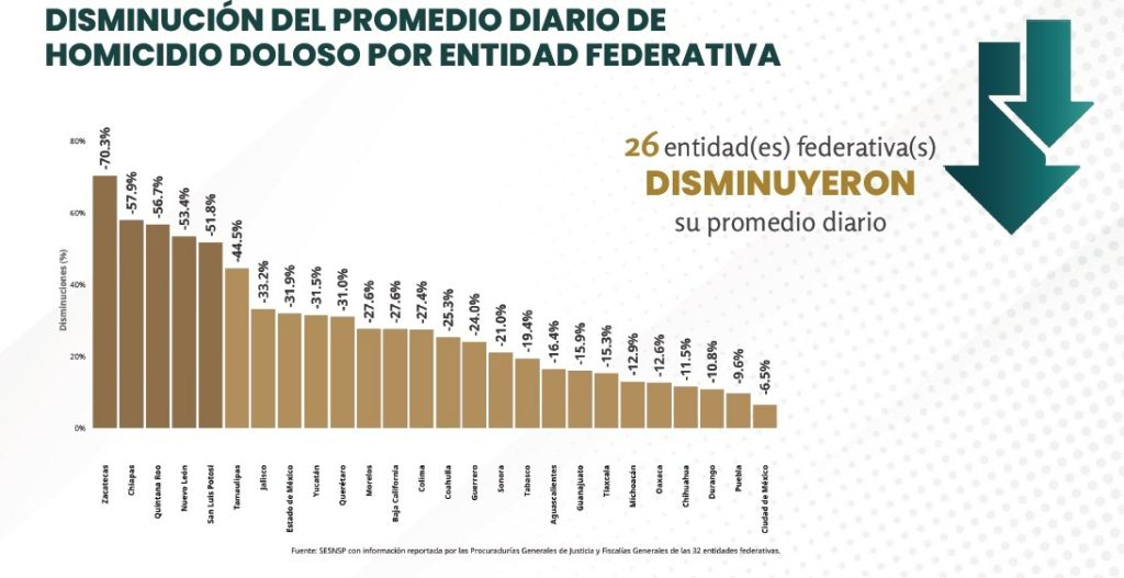 En el caso de Tlaxcala, la reducción es de 15.3%, con base en la estadística del mes de noviembre presentada por la funcionaria federal este día durante la conferencia matutina “Las mañaneras del pueblo” encabezada por la presidenta de México, Claudia Sheinbaum Pardo, quien resaltó que, gracias a la implementación de la Estrategia Nacional de Seguridad, se logró una reducción del 37 por ciento en el promedio diario de homicidios dolosos, de septiembre de 2024 a noviembre de 2025.
