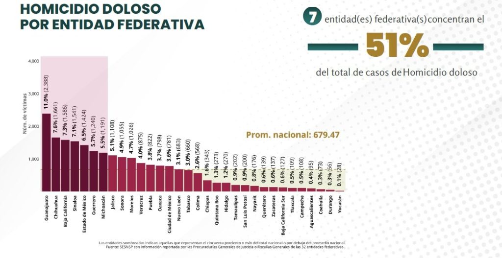 De enero a noviembre de 2025, seis estados registraron la menor incidencia en este delito: Tlaxcala (con 109 casos), Campeche (108), Aguascalientes (95), Coahuila (73), Durango (56) y Yucatán (28), muy por debajo del promedio nacional (679.47). En contraste, siete entidades concentran el 51 por ciento del total de casos de homicidio doloso: Guanajuato (2 mil 388), Chihuahua (mil 661), Baja California (mil 586), Sinaloa (mil 541), Estado de México (mil 424), Guerrero (mil 240) y Michoacán (mil 191).