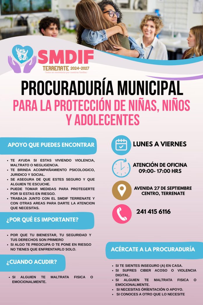 La Procuraduría ofrece atención de lunes a viernes en un horario de 9:00 a 17:00 horas, en las oficinas ubicadas en Avenida 27 de Septiembre, Centro de Terrenate. Para orientación o solicitudes de apoyo, se encuentra disponible el número 241 415 6116. Con estas acciones, el Gobierno Municipal y el SMDIF refuerzan su compromiso de construir un entorno más seguro, humano y protector para las nuevas generaciones.